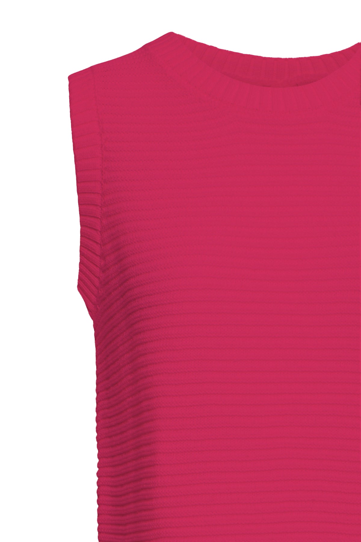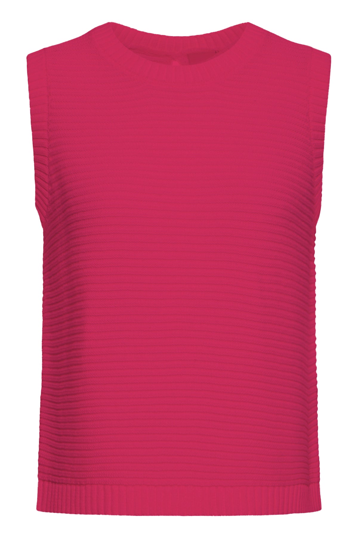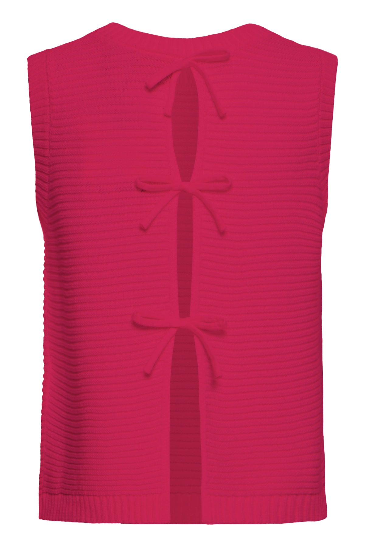 Haut sans manches en maille côtelée de couleur fuchsia, au style minimaliste et raffiné. Son détail signature : un dos ouvert structuré par trois liens à nœuds en tissu, créant une découpe verticale graphique et féminine. Encolure ronde, coupe ajustée, finitions en côte sur le col et l'ourlet.