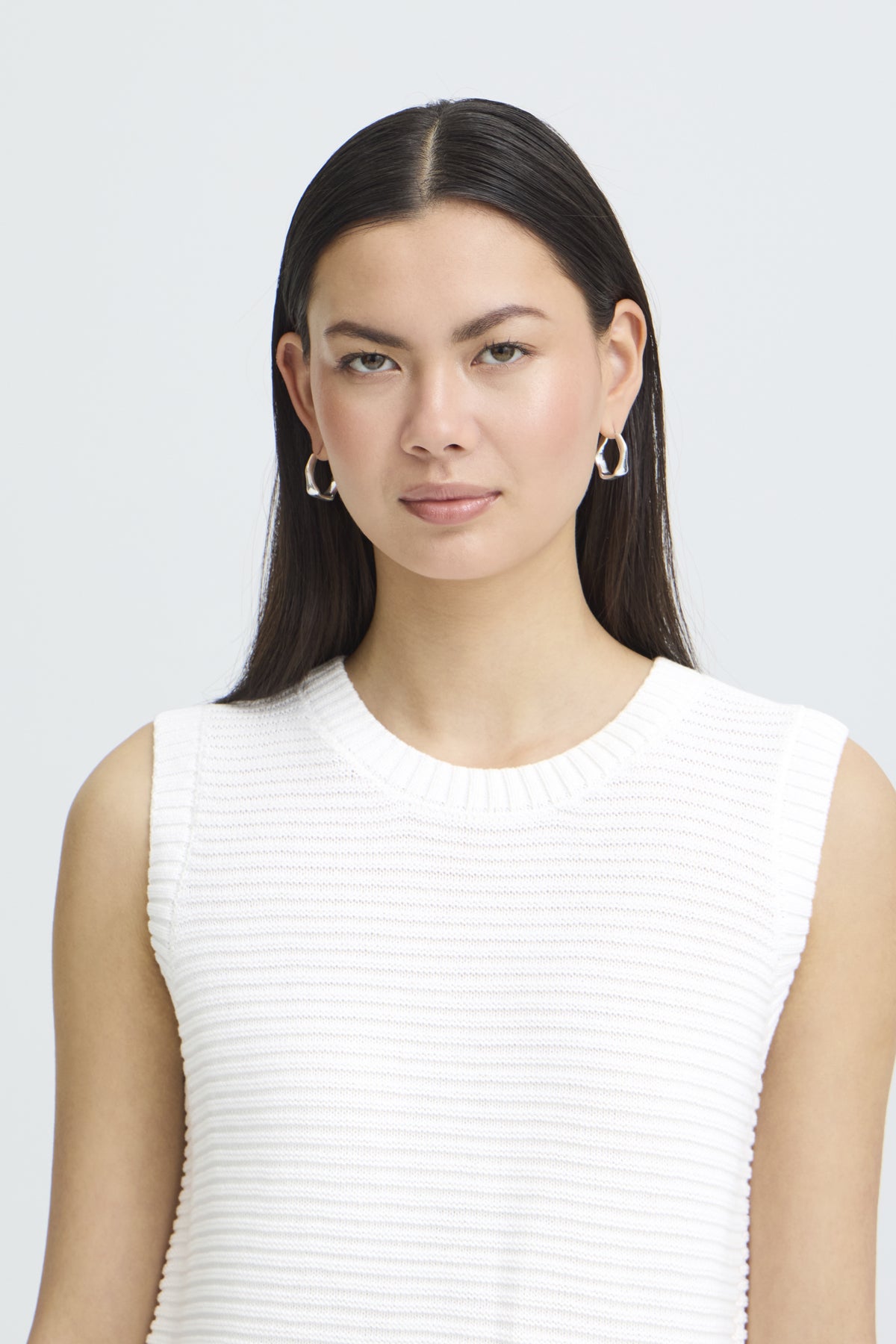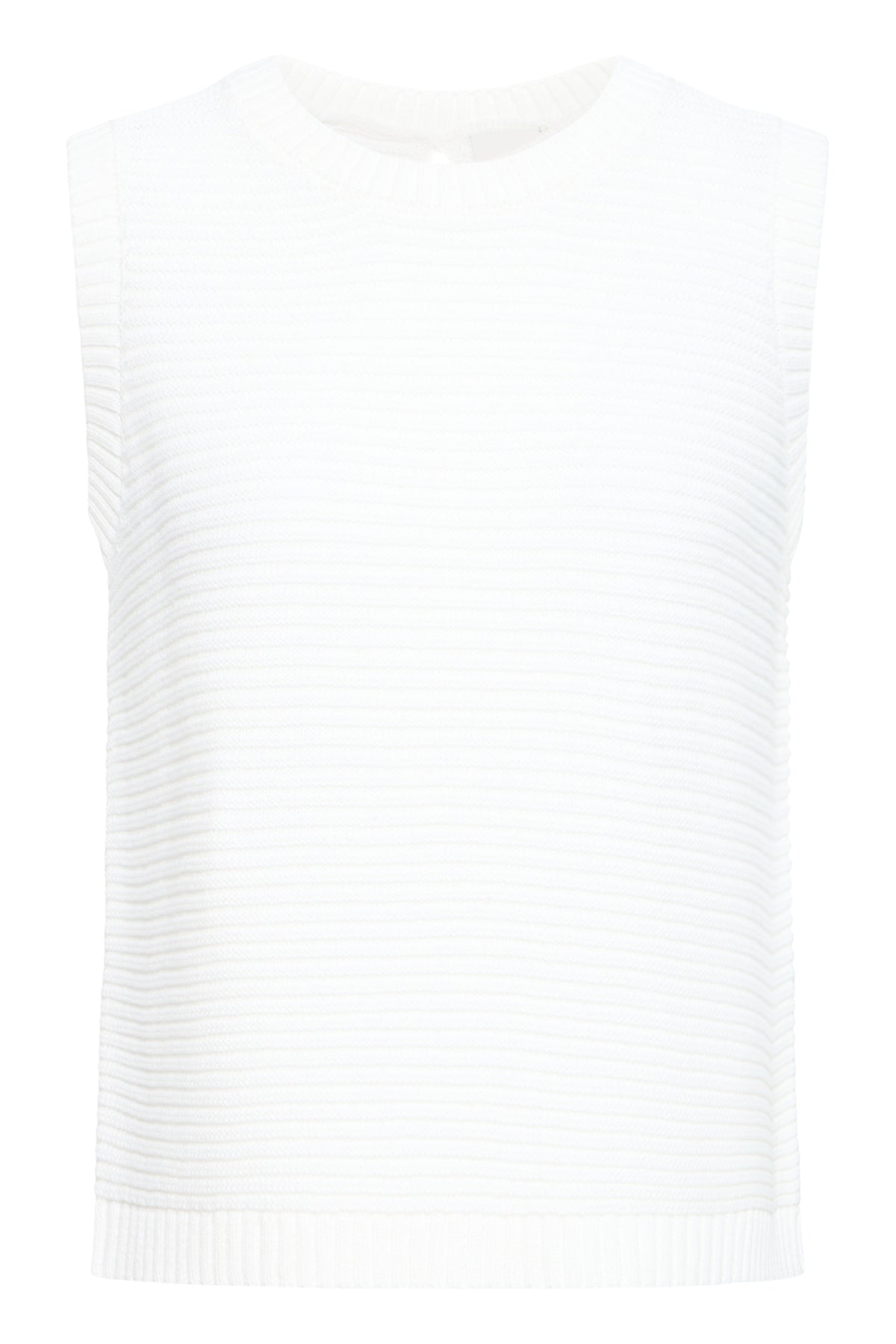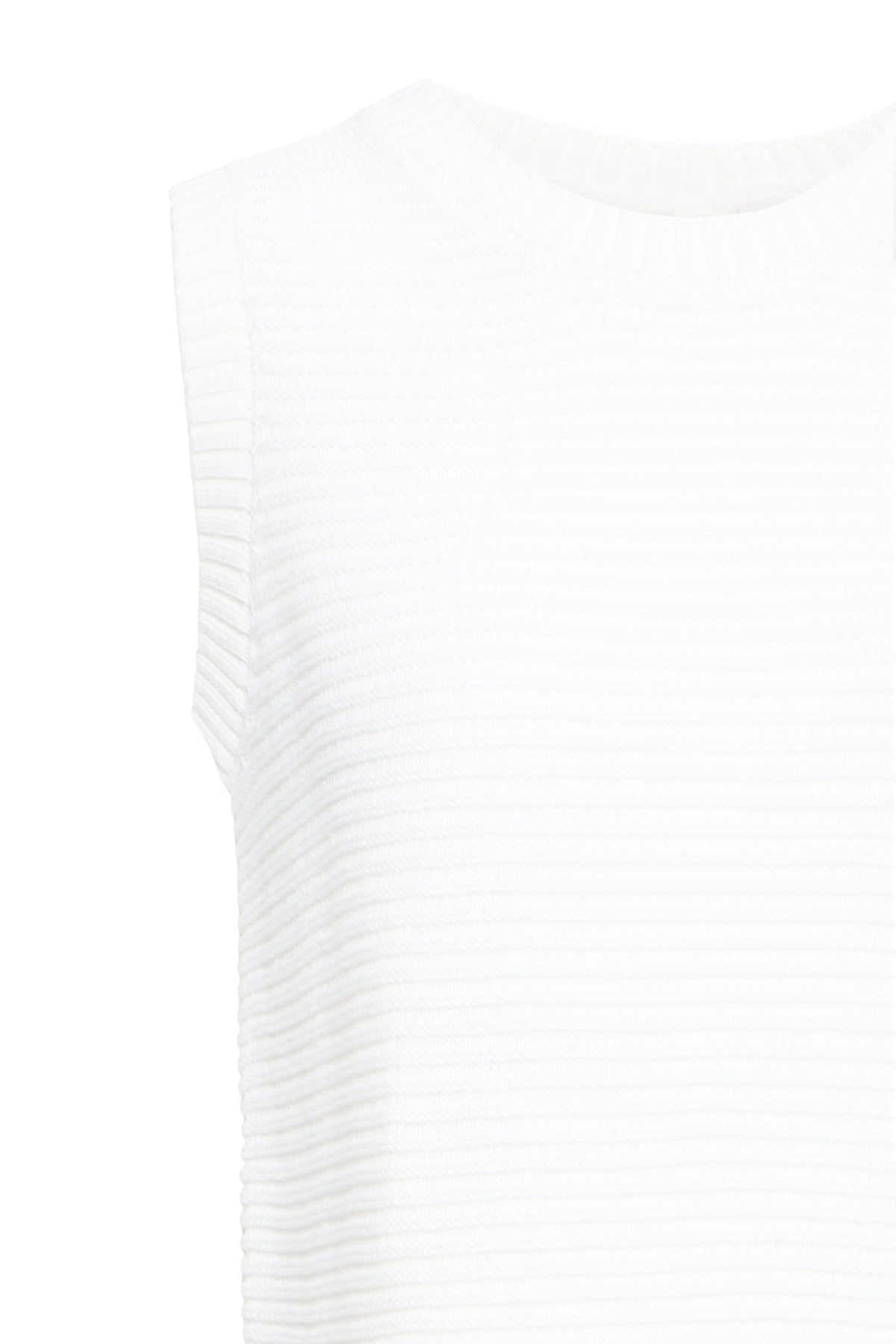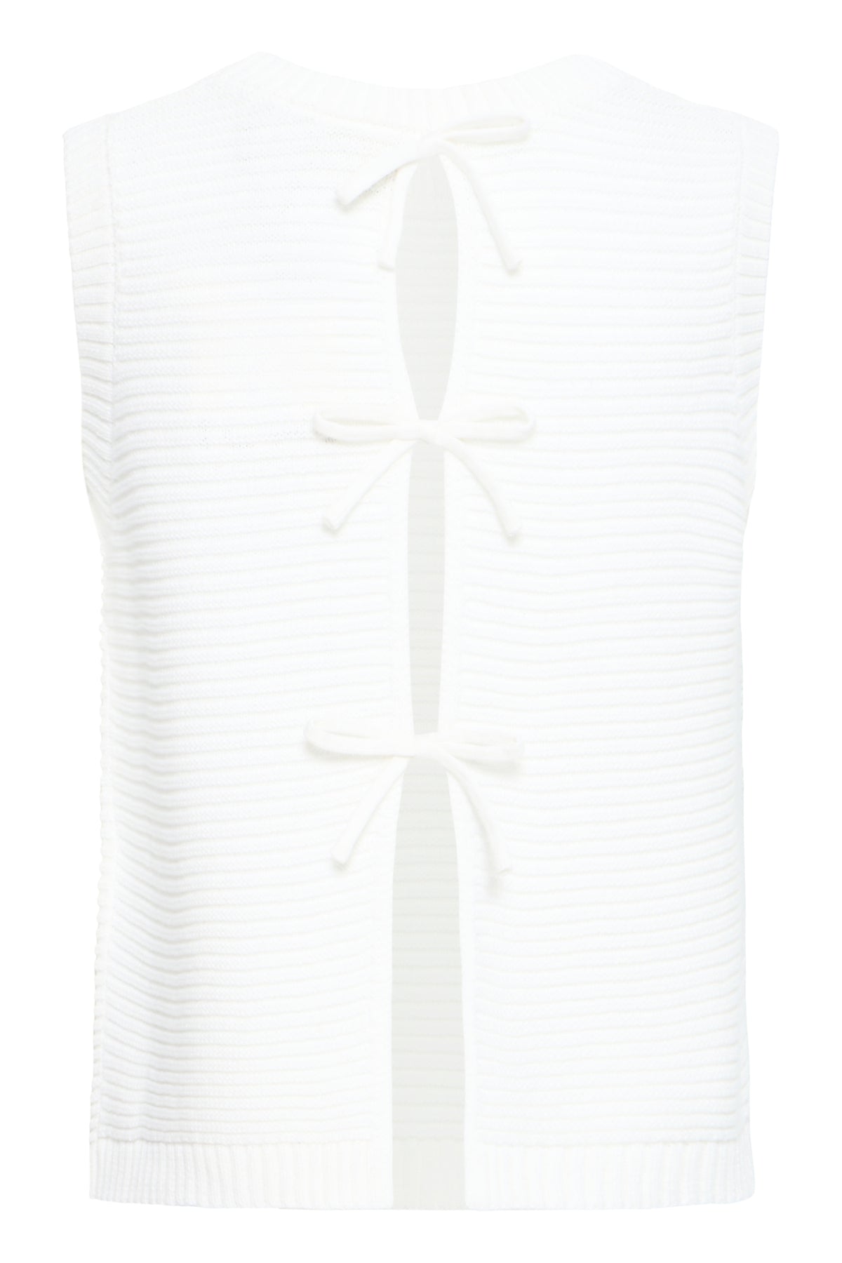 Haut sans manches en maille côtelée de couleur blanc ivoire, au style minimaliste et raffiné. Son détail signature : un dos ouvert structuré par trois liens à nœuds en tissu, créant une découpe verticale graphique et féminine. Encolure ronde, coupe ajustée, finitions en côte sur le col et l'ourlet.