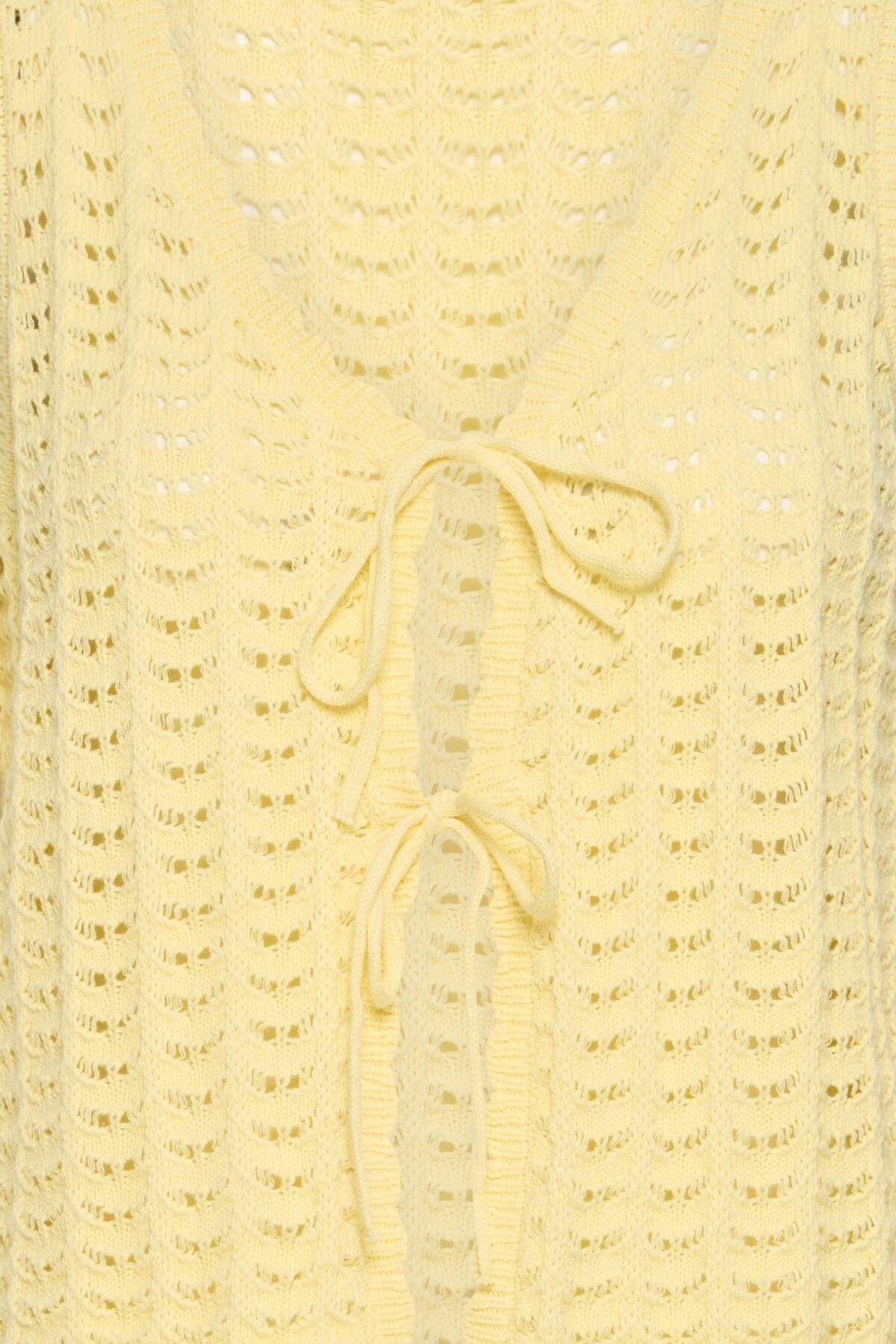 Légère et ensoleillée, cette veste sans manches en maille crochet ajourée s'impose comme la pièce estivale par excellence. Ses deux liens à nouer en façade, son encolure festonnée et ses finitions ondulées lui donnent un charme artisanal irrésistible.
